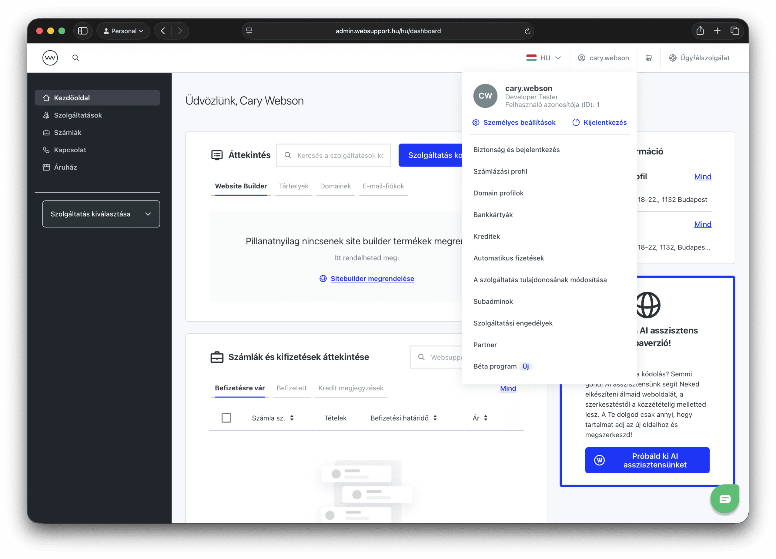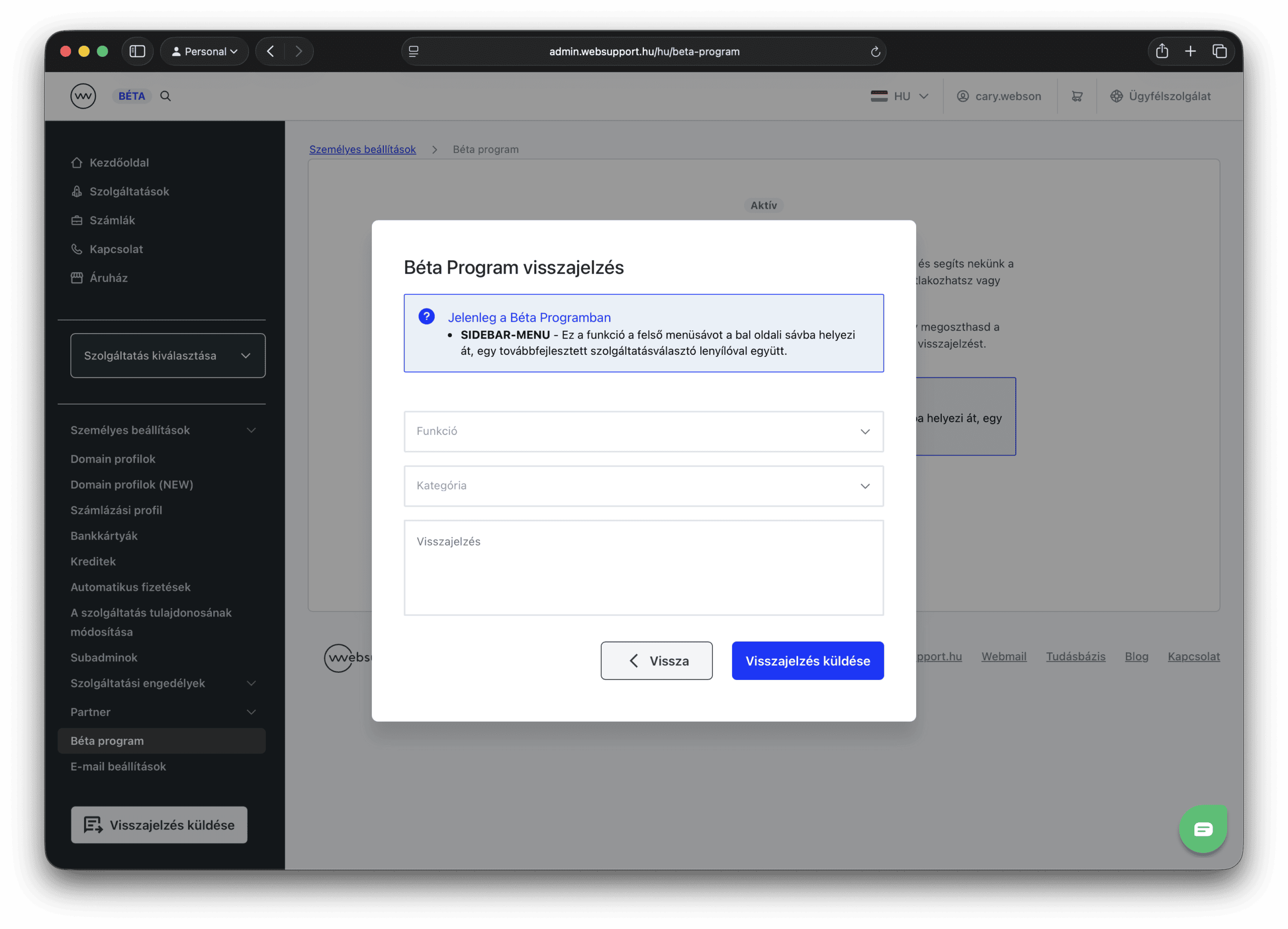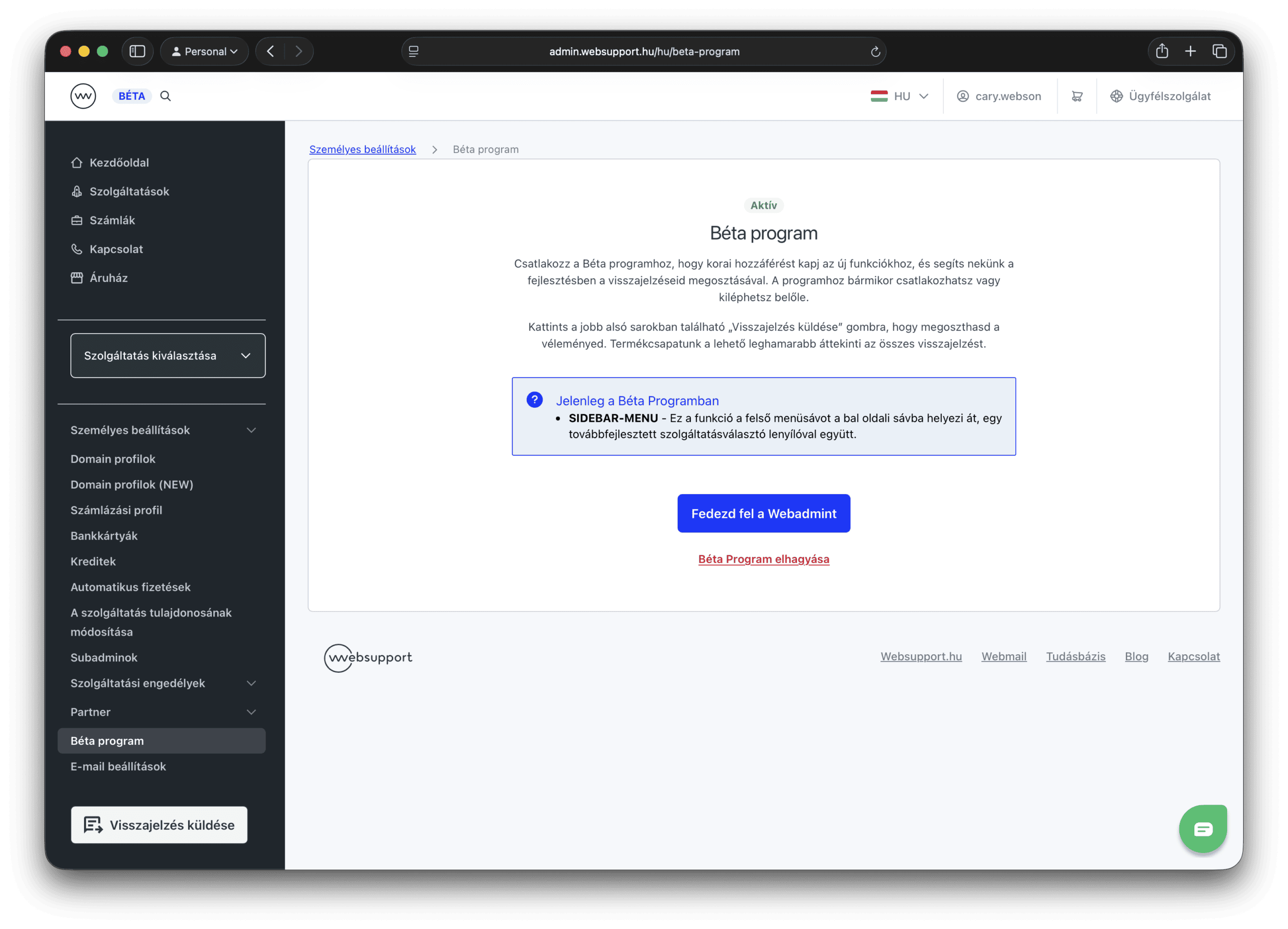 Ez nem egy különálló környezet, hanem a WebAdmin éles rendszere, amelyben feloldhatod az éppen készülő funkciókat. Ha a Béta program keretében módosítod a szolgáltatásaid beállításait, ezek a változtatások akkor is aktívak maradnak, ha később kikapcsolod a programot.