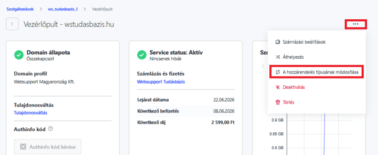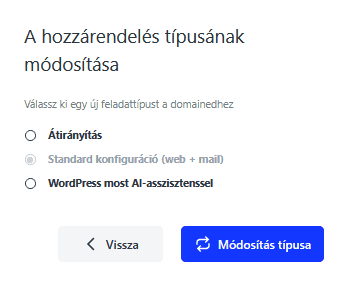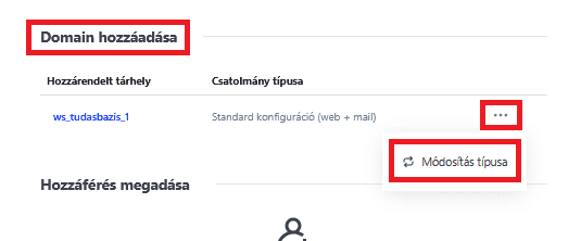 A következő oldalon a Domain hozzáadása blokk alatt láthatod a jelenlegi hozzárendelési típust és a … linkre klikkelve tudod ezt megváltoztatni, a Módosítás típusa menüpontra kattintva.