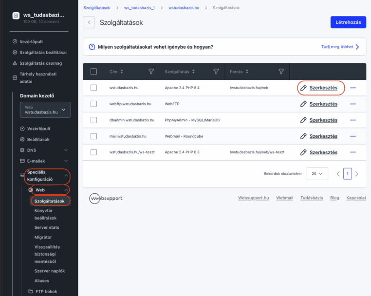 3. A szolgáltatások listájában továbbra is szerkeszthető – minden szolgáltatás (pl. aldomain teszt.domain.hu, különböző PHP verziót lehet beállítani ezekhez is.