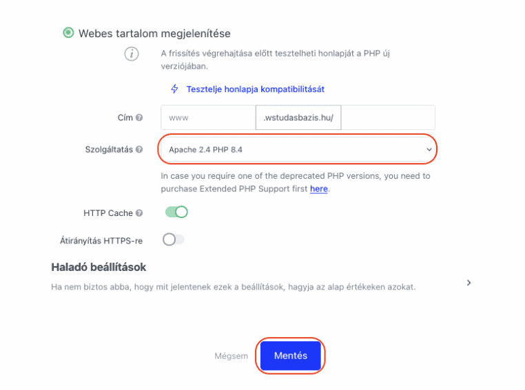 4. A megjelenő felületen pedig válaszd ki a kívánt PHP verziót, és kattints a Mentés gombra.