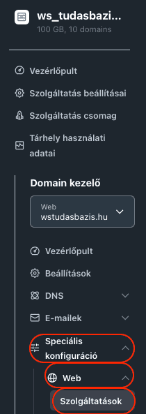 2. Válaszd ki a kívánt domaint, és kattints a Speciális konfiguráció majd a Web menüpontra, ezen belül pedig a Szolgáltatások-ra.
