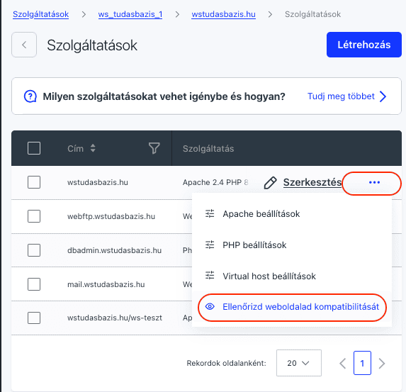 5. Az ellenőrizni kívánt domain mellett kattints a három pontra, majd a lenyíló menüben válaszd az Ellenőrizd a weboldalad kompatibilitását menüt.