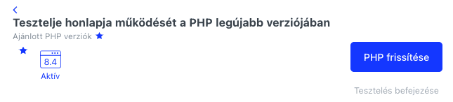 A tesztfelületen az összes elérhető PHP verziót tudod tesztelni. Bármely verzióra kattintva azonnal megtekintheted az oldalt, és ellenőrizheted, hogy minden rendben van-e. Ha az oldal a PHP verzió módosítása után működik, és a módosításokat menteni szeretnéd, kattintson a PHP frissítése lehetőségre.