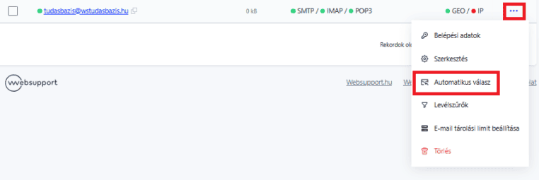 Ha huzamosabb ideig nem férsz hozzá a levelezésedhez vagy hosszabb szabadságra készülsz, érdemes beállítani egy automatikus válasz e-mailt az admin.websupport.hu felületen keresztül. A beállításhoz az alábbi lépéseket szükséges követned: