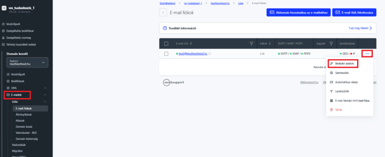 - Kattints az adott e-mail cím sorának végén látható … linkre, majd válaszd a lenyíló menü Belépési adatok menüpontját.