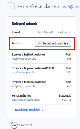 Az admin.websupport.hu felületen keresztül tudod módosítani az e-mail fiókod jelszavát az alábbi módon: