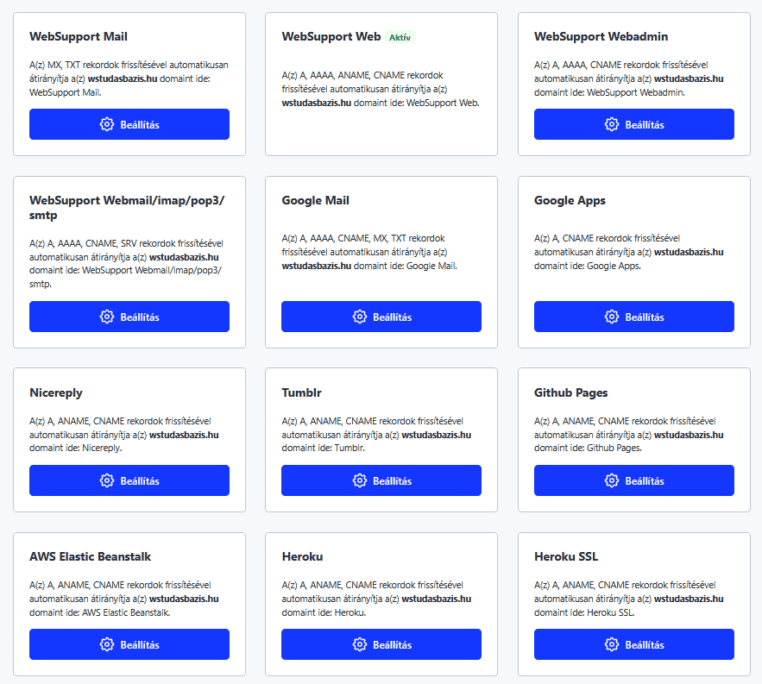 Tudtad, hogy a webadminon keresztül akár két kattintással is frissítheted a DNS beállításokat? Szervereinken akár egyéb külső szolgáltatók (pl. Google Mail, Shoptet, stb.) rekordjai is könnyedén és gyorsan beállíthatóak, nem szükséges egyesével felvenned a szolgáltatóhoz tartozó értékeket.