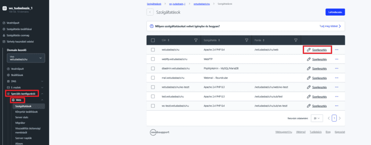 - A Szolgáltatások főmenü alatt kattints az adott domainre.