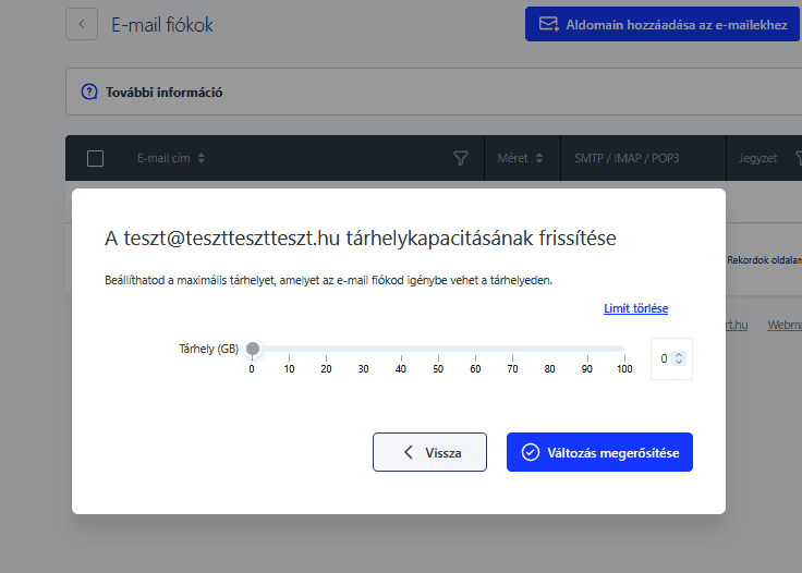 5. A csúszkán válaszd ki a maximális tárhelyméretet, amelyet az adott fiók felhasználójának adnál, majd a Változás megerősítése gombra klikkelve mentsd el a beállítást.