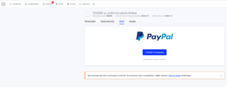 A díjbekérődet akár PayPal-on keresztül is rendezheted a webadmin felületen keresztül. Ehhez a Számlák főmenüpont alatt kattints a rendezni kívánt díjbekérő sorszámára, majd a jobb felső sarokban látható Fizetés gombra, és válaszd a PayPal lehetőséget.