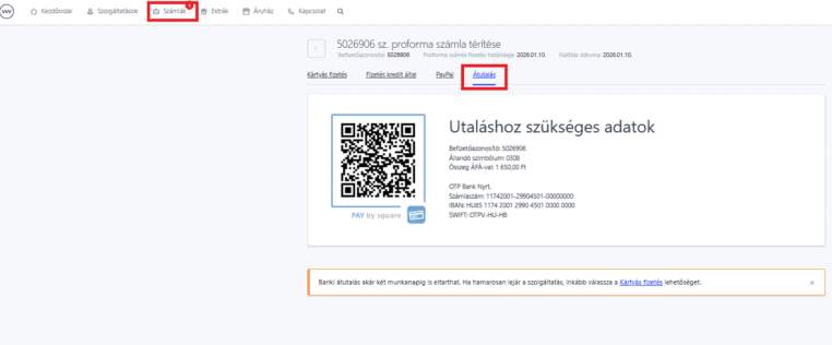 A fizetést banki utalással is teljesítheted bankszámlánkra. Az utaláshoz szükséges adatokat a díjbekérő e-mailben találod, illetve a webadmin felületen is elérhetőek az információk a Számlák menüpont alatt a díjbekérő sorszámára kattintva.