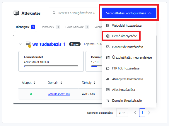 3. Válaszd a lenyíló menü Demó áthelyezése menüpontját. Ez a lehetőség csak akkor jelenik meg, ha aktív tárhely van a fiókodban.