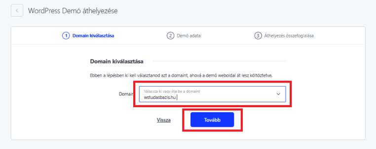A következő lépésben válassz ki egy domaint a listából, majd kattints a Tovább gombra.