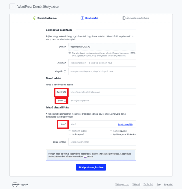 Ezután átirányítunk a következő oldalra, ahol a WordPress demó adatait szükséges megadnod. A kötelezően kitöltendő mezőket az alábbi képen piros négyzettel jelöltük.