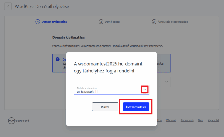 Válaszd ki a tárhelyet, amelyhez szeretnéd hozzárendelni a domaint, majd kattints a Hozzárendelés gombra.