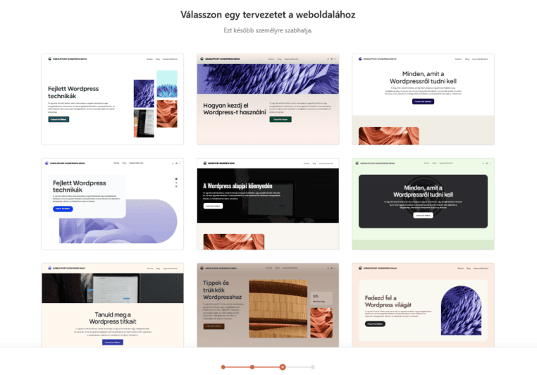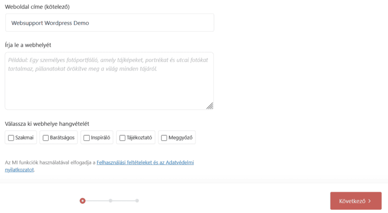 Ezután átirányítunk a következő oldalra, ahol a WordPress demó adatait szükséges megadnod. A kötelezően kitöltendő mezőket az alábbi képen piros négyzettel jelöltük.